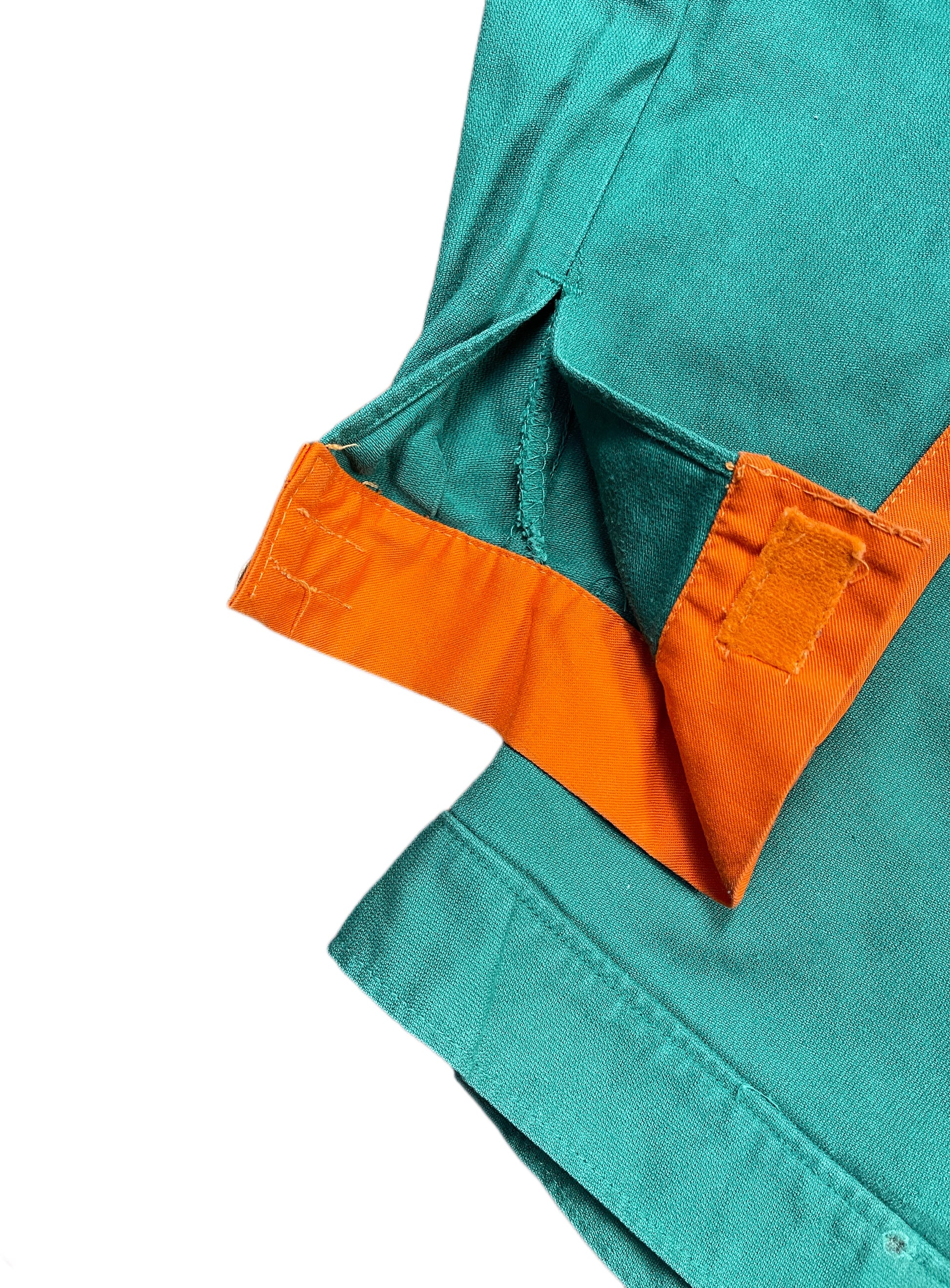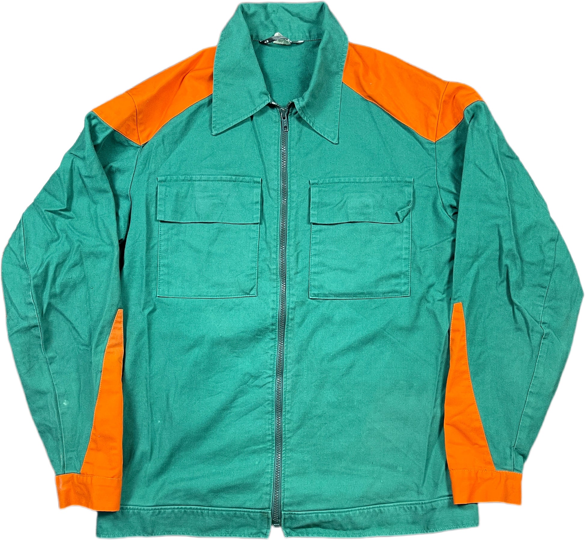 Defy convention with this vintage workwear jacket in striking green cotton. A fearless relic from an era when clothes were built to outlast their owners. Its weathered fabric bears witness to adventures past, while daring you to carve your own rebellious path. Not just a jacket—it's an audacious statement against disposable fashion and a bold invitation to stand apart from the crowd.