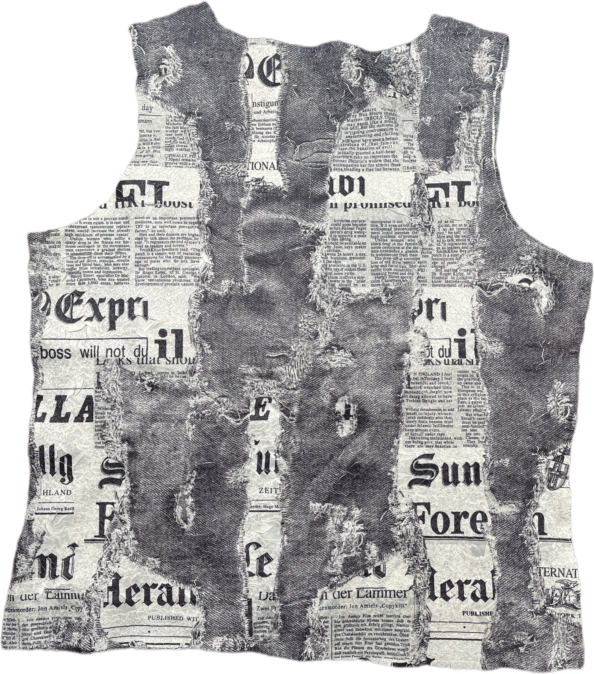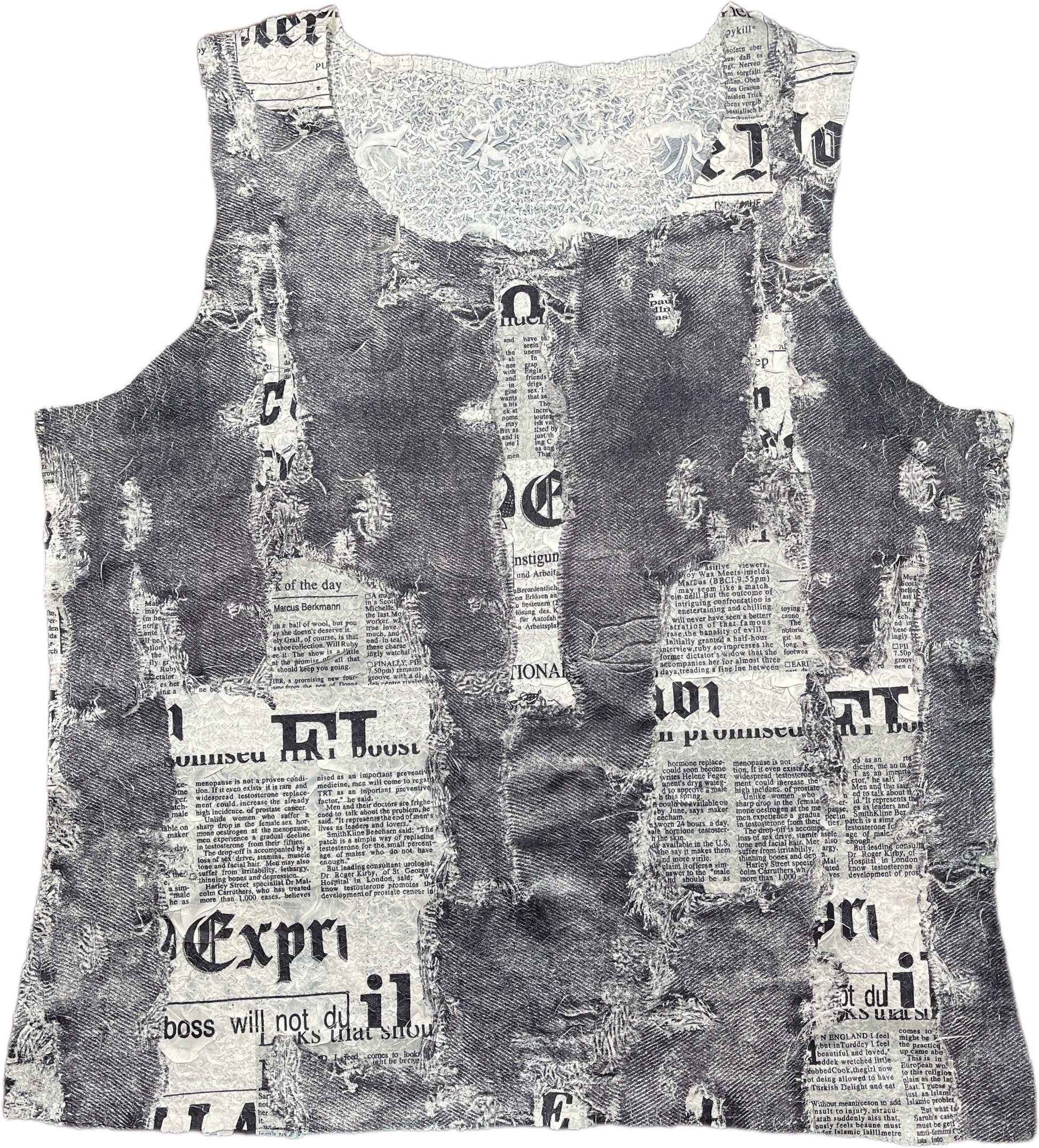 This Y2K-inspired sleeveless top in gray features a bold synthetic fabric printed with edgy newspaper cut designs. Its daring style captures the rebellious spirit of early 2000s fashion, perfect for making a statement wherever you go. Lightweight and eye-catching, it pairs effortlessly with your favorite streetwear for a standout look.